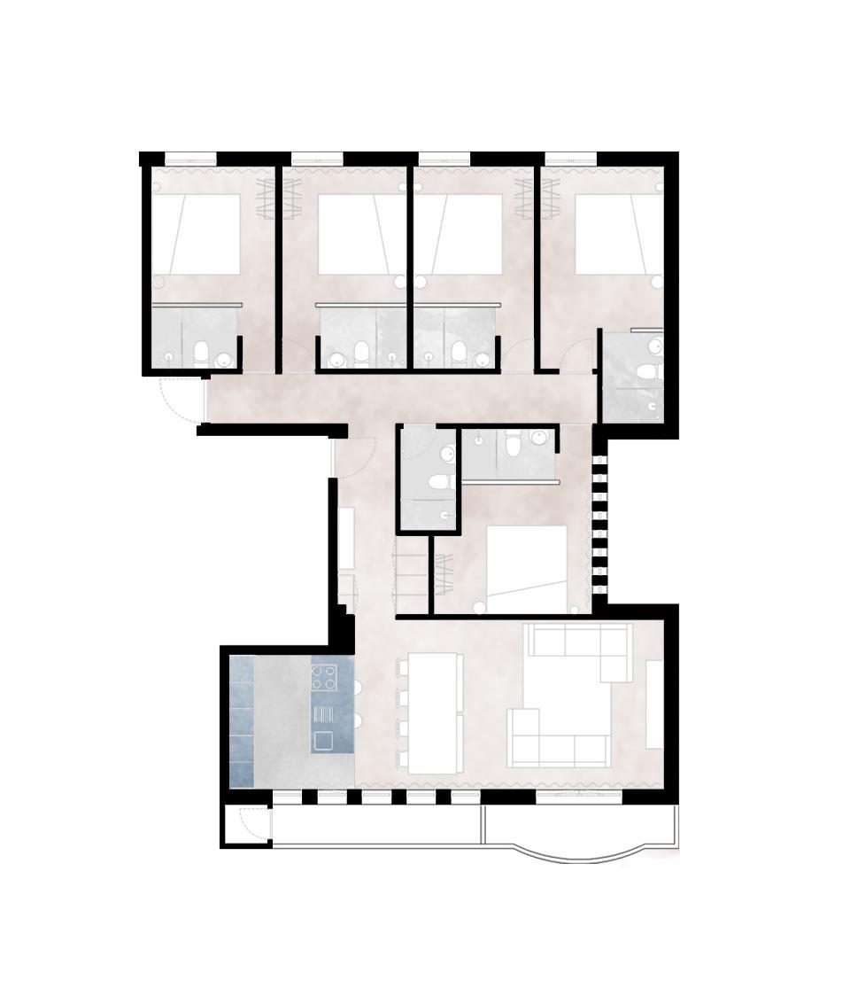 Otimização de fração de tipologia T4 com quatro quartos e uma casa de banho completa em cinco suítes.
